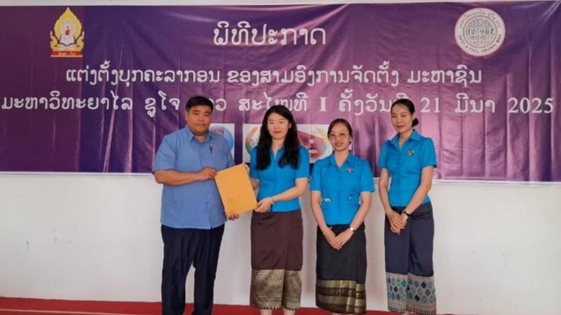 2025年3月21日下午,阳光明媚的校园内洋溢着庄重而喜庆的氛围,老挝苏州大学第一届共青团、工会、妇联组织管理小组任命仪式在教学楼大礼堂前边大厅隆重举行。全校师生齐聚一堂,共同见证了这一具有里程碑意义的历史时刻。