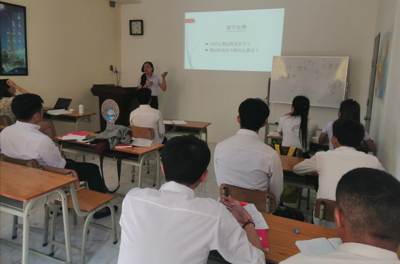 学生听完讲座,兴趣盎然,不时发问,现场气氛极其融洽;更有学生主动上台讲述自己知道的神话和寓言故事。希玥用流畅简单的语言给大家讲了“泼水节的来历”,形象生动。康碧给大家介绍了万象著名的几座寺庙,包括西蒙寺、玉佛寺等等,引人入胜。唐令阳描述了“龟兔赛跑”的故事,风趣幽默。台下师生听得津津有味,纷纷为他们的优秀表现鼓掌。