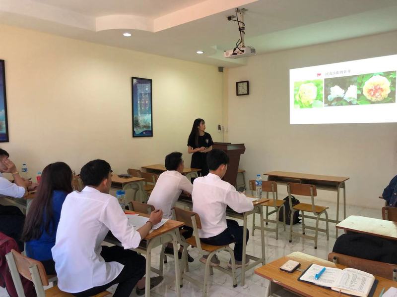 10月14日上午,在“初级汉语语音”的课堂上,开展了“随堂识中国”文化知识养成计划第五次活动,主题为“四大名花”,由汉语教师乐俊兰主讲。乐俊兰用精彩的PPT和富有启发性的语言,生动形象地展示了河南洛阳牡丹、浙江杭州菊花、云南昆明山茶花以及福建漳州水仙花的魅力,并介绍了每一种花的花语。在 场学生都听得十分入迷,很快将四大名花的产地、种类和花语牢记于心。