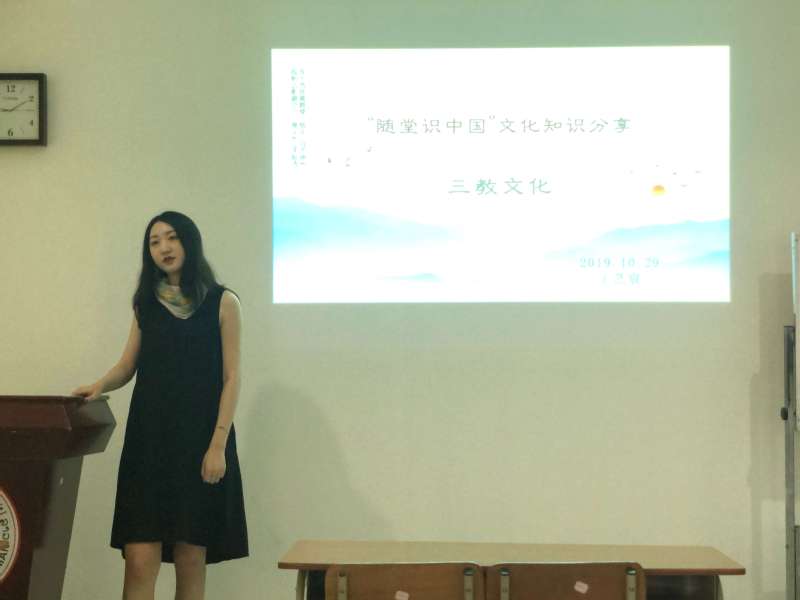 10月29日上午,在“初级口语交际”的课堂上,开展了“随堂识中国”文化知识养成计划的第七次活动。主题是“三教文化”,由中文课教师王艺宸主讲。儒、释、道三教是中国传统文化及其重要的一个篇章,王艺宸用精心准备的照片和视频,向学生们讲解了三教的主要内容以及它们对中国社会产生的巨大影响。在以往的学习中,学生们对儒家文化的代表人物孔子已有了一定的了解;而佛教则是老挝的国教,所以大家都兴致盎然地讨论着对三教的看法。