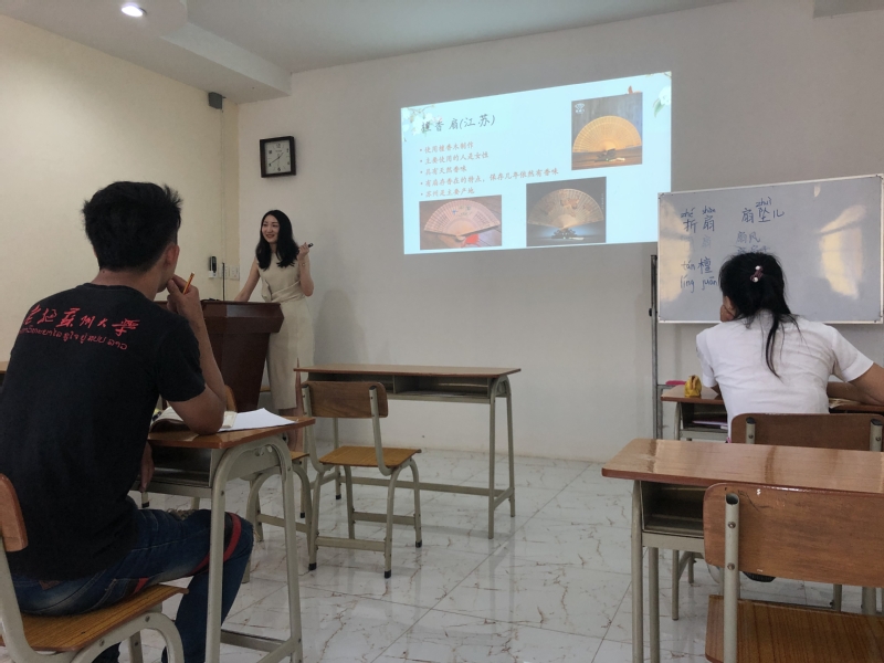 10月10日下午,在“初级口语交际”的课堂上,“随堂识中国”文化知识养成计划第四次活动顺利开展,主题为“四大名扇”,由中文课教师王艺宸主讲。王艺宸用精心准备的照片和视频向学生们展示了独特的中国扇文化。江苏的檀香扇、四川的竹丝扇等等精美的工艺品令学生们大开眼界,他们表示没想到一把小小的扇子背后却有着深厚的文化底蕴。