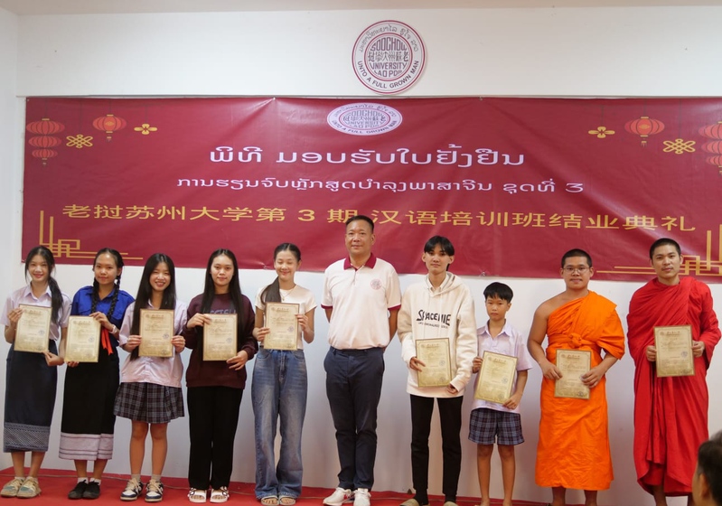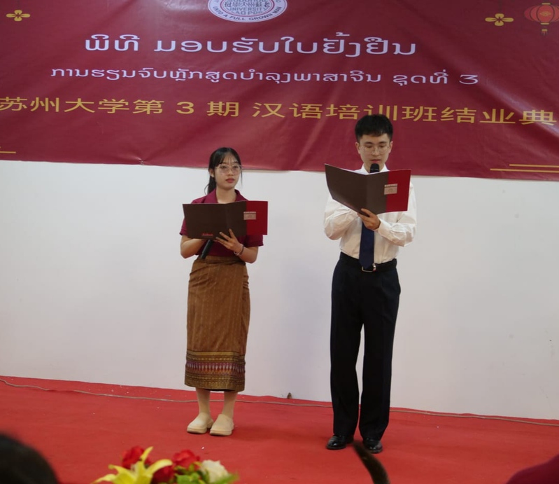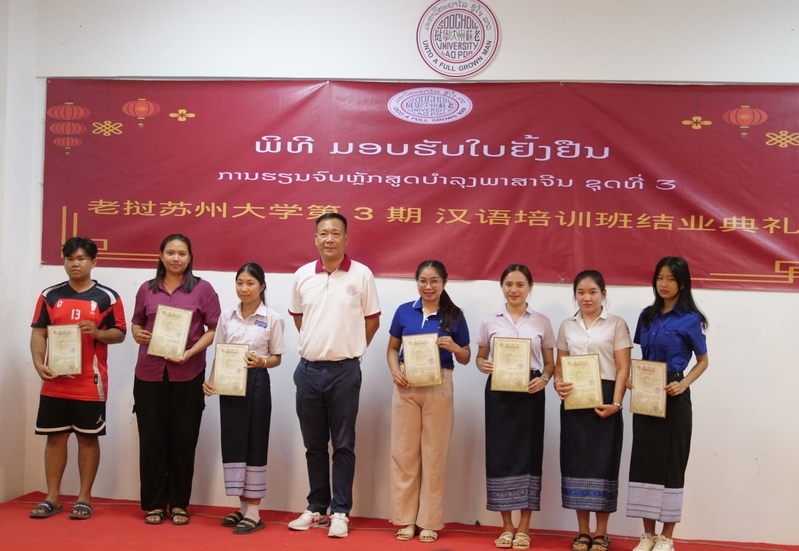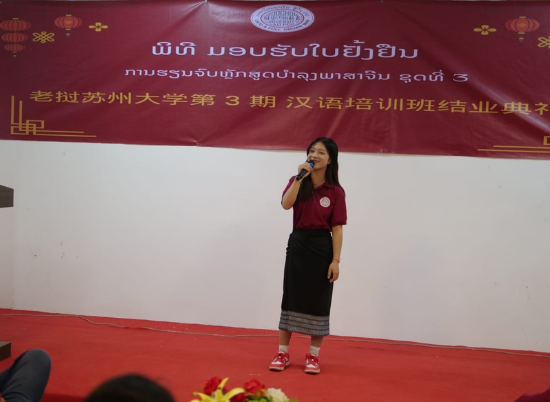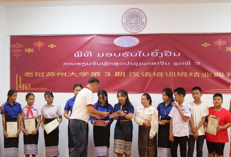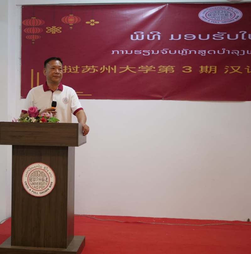 学校负责人黄文军在典礼上发表了振奋人心的贺词。他向每一位顺利获得结业证书的学员表示了最热烈的祝贺,并对他们在汉语培训班期间所付出的辛勤努力和取得的显著进步给予了高度肯定。黄文军自豪地表示:“老挝苏州大学不仅致力于提供高质量的本科和汉语培训教学,还致力于为老挝人民走向世界各地,尤其是前往中国留学,提供更强大的支持和助力。”