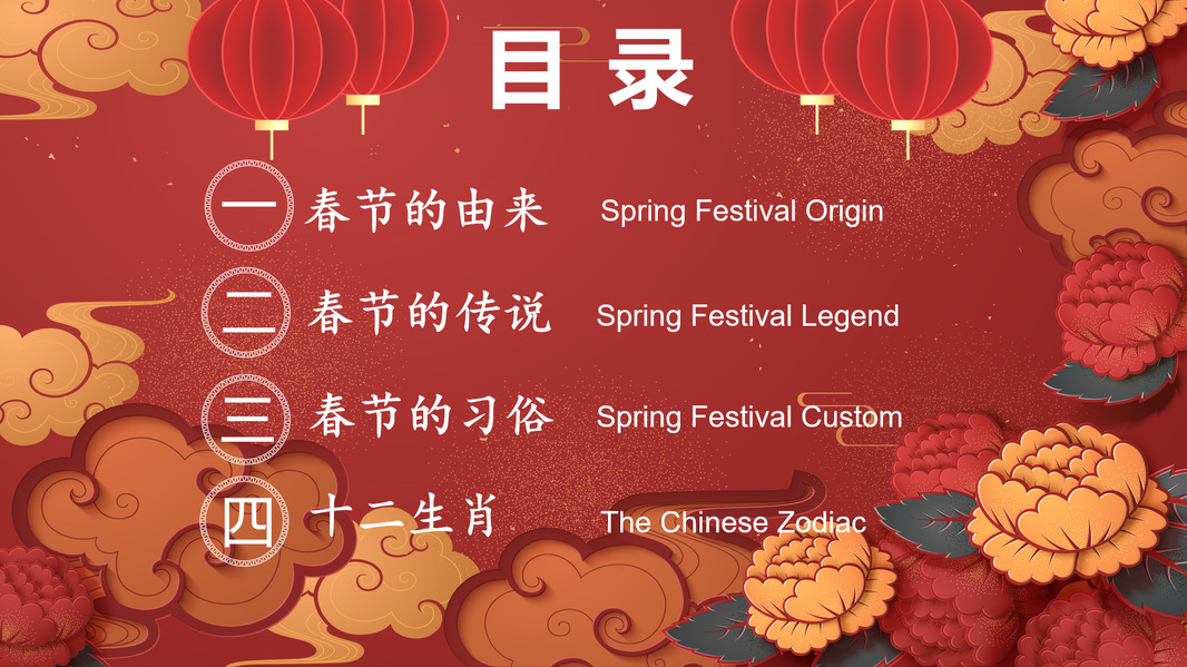 春节,不仅是中华民族共同欢庆的传统佳节,更是民族文化的重要象征。以团圆为内核,春节承载着人们对美好生活的向往与追求,同时也蕴含着深厚的历史底蕴。本堂课重点介绍春节的由来、春节的传说、春节的习俗以及十二生肖的故事。