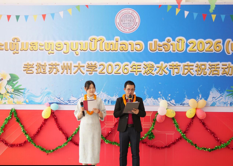 4月11日上午,老挝苏州大学2026年泼水节(宋干节)庆祝活动隆重举行。老挝教育与体育部原副部长、老挝苏州大学顾问孔西・胜玛尼,老挝教育与体育部高等教育司司长该松・彭锁帕,老挝民办教育协会副会长波迪・西替农通、副会长巴西替朋・彭弯塔,老挝教育与体育部学生管理司信息与新闻管理处处长拉妮,老挝教育与体育部对外联络司行政处副处长万塔娜弯・塞亚松,老挝苏州大学顾问普米、洪平等嘉宾及全体师生欢聚一堂,共庆老挝传统新年,传承民俗文化,共叙中老友谊。