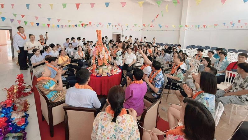 活动中,学生代表以中老双语朗诵新年祝愿诗,传递青春祝福。随后,阿宽老师主持穿线祈福仪式,为师生系上吉祥线,带领学生诵读道歉词,现场氛围庄重温馨。