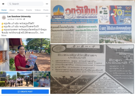 ສໍາລັບວຽກງານການໂຄສະນາຮັບສະໝັກນັກສຶກໃນປີນີ້ແມ່ນໄດ້ເນັ້ນການໂຄສະນາຜ່ານສື່ສັງຄົມອອນລາຍເປັນຫຼັກ,ສໍາລັບການໂຄສະນາແບບດັ້ງເດີມ ທີ່ເຄີຍເຮັດຜ່ານມາ ກໍໄດ້ເຮັດໄປຄວບຄູ່ກັນ. ໃນນັ້ນ,ພວກເຮົາໄດ້ເນັ້ນການຖ່າຍທໍາວີດີໂອ ບັນຍາກາດ ແລະ ລາຍລະອຽດຂອງການຄຸ້ມຄອງບໍລິຫານ ແລະການຈັດຕັ້ງການຮຽນການສອນຕ່າງໆ ເພື່ອສື່ອອກໄປໃຫ້ສັງຄົມໄດ້ຮັບຮູ້, ພ້ອມດຽວກັນນັ້ນ ມຊລຍັງໄດ້ສົ່ງວີດີໂອໂຄສະນາລົງໃນ Facebook ຂອງມະຫາວິທະຍາໄລເປັນປະຈໍາ. ນອກນັ້ນ,ຍັງໄດ້ລົງໂຄສະນາຜ່ານສື່ໜັງສືພິມ, ລົງແຈກຢາຍແຜ່ນພັບໂຄສະນາ ຢູ່ຕາມສູນສອບເສັງຈົບ ມ7.ຜ່ານການໂຄສະນາດັ່ງກ່າວ, ແມ່ນໄດ້ມີນັກຮຽນ ແລະ ຜູ້ປົກຄອງໂທມາສອບຖາມເປັນຈໍານວນຫຼາຍ, ໄດ້ມີຜູ້ເຂົ້າເບິ່ງໜ້າໂຄສະນາຜ່ານທາງFacebook ຂອງມຊລ ເປັນຈໍານວນຫຼາຍກວ່າ 10000 ເທື່ອຄົນ, ສະເລ່ຍໃນແຕ່ລະວັນໄດ້ມີ ຜູ້ປົກຄອງ ຫຼືນັກຮຽນ ໂທມາສອບຖາມ ຫຼື ເຂົ້າມາສອບຖາມທີ່ຫ້ອງການ ຈໍານວນ 10 ກວ່າຄົນ.