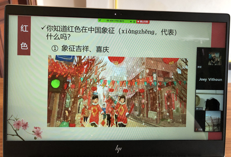 ເນື່ອງຈາກຜົນກະທົບຈາກCOVOD-19, ການບັນຍາຍໃນຄັ້ງນີ້ແມ່ນຈໍາຕ້ອງໄດ້ສືບຕໍ່ການບັນຍາຍຜ່ານລະບົບ ອອນລາຍ, ອາຈານ ລູ້ຖິງຖິງ ໄດ້ຮັບໜ້າທີ່ທໍາການບັນຍາຍ ໂດຍໄດ້ນໍາໃຊ້ຮູບພາບທີ່ສວຍງາມຈັບໃຈ ແລະ ໃຊ້ສັບສໍານວນ ທີ່ອ່ອນຊ້ອຍເຂົ້າໃນການບັນຍາຍ, ແນະນໍາກ່ຽວກັບຄວາມຮູ້ພື້ນຖານກ່ຽວກັບວັດທະນະທໍາການເລືອກໃຊ້ສີຂອງຄົນຈີນ. ພາຍຫຼັງການແນະນໍາກ່ຽວກັບການແຍກປະເພດສີຂອງຄົນຈີນແຕ່ອາດີດຈັນເຖິງປະຈຸບັນນີ້ແລ້ວ, ຍັງໄດ້ນໍາໃຊ້ວີດີໂອ ເຂົ້າໃນການແນະນໍາກ່ຽວກັບຄວາມໝາຍແລະກາລະເທສະໃນການນໍາໃຊ້ສີແຕ່ລະສີສໍາລັບຄົນຈີນ, ໄດ້ສ້າງຄວາມດຶງດູດ ໃຫ້ແກ່ນັກຮຽນໄດ້ເປັນຢ່າງດີ. ທ້າຍສຸດ, ໄປຄຽງຄູ່ກັບການຮຽນຮູ້ຄໍາສັບພາສາຈີນກ່ຽວກັບສີນັ້ນ, ນັກສຶກສາໄດ້ຫຼົງມັກ ໃນສະເໜ່ກ່ຽວກັບວັດທະນະທໍາການເລືອກໃຊ້ສີຂອງຄົນຈີນໂດຍບໍ່ຮູ້ຕົວ.